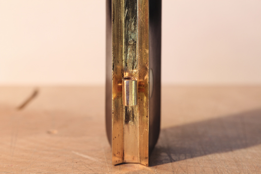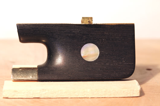 A fine gold mounted viola bow (unstamped) was brought to us for repair work. There was substantial damage to the gold underside. This had been caused by trying to tighten the eyelet by using the screw and button as well as a pair of common hardware store pliers. Neither of these approaches is actually suitable for tightening or loosening the eyelet.
