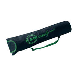 For music stands 100/1, 10062 and 10065. Waterproof nylon carrying case featuring hook-and-loop flap fastener and adjustable shoulder strap. Black with green straps and silk-screened K&M logo. Length: 50 cm.